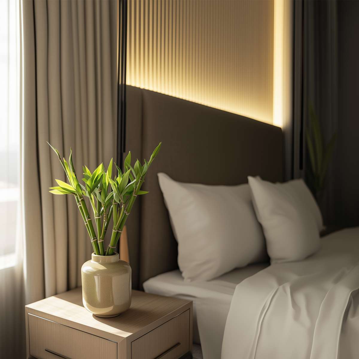 Glücksbambus wird normalerweise nur in Wasser verkauft, wächst aber natürlich in Erde. Das Wasser, in dem er gelagert wird, sollte alle zwei Wochen gewechselt werden. Er wird oft als lichtarme Zimmerpflanze beschrieben. Die Stängel gedeihen in Räumen mit schwachem bis mittlerem Licht. Vermeiden Sie direktes Sonnenlicht, um Blattbrand zu vermeiden. Es ist wichtig, eine Raumtemperatur zwischen 15 und 25 Grad Celsius einzuhalten, aber Glücksbambus verträgt auch etwas mehr Wärme. Hinweis: Glücksbambus ist giftig für Haustiere und sollte außerhalb ihrer Reichweite aufbewahrt werden.