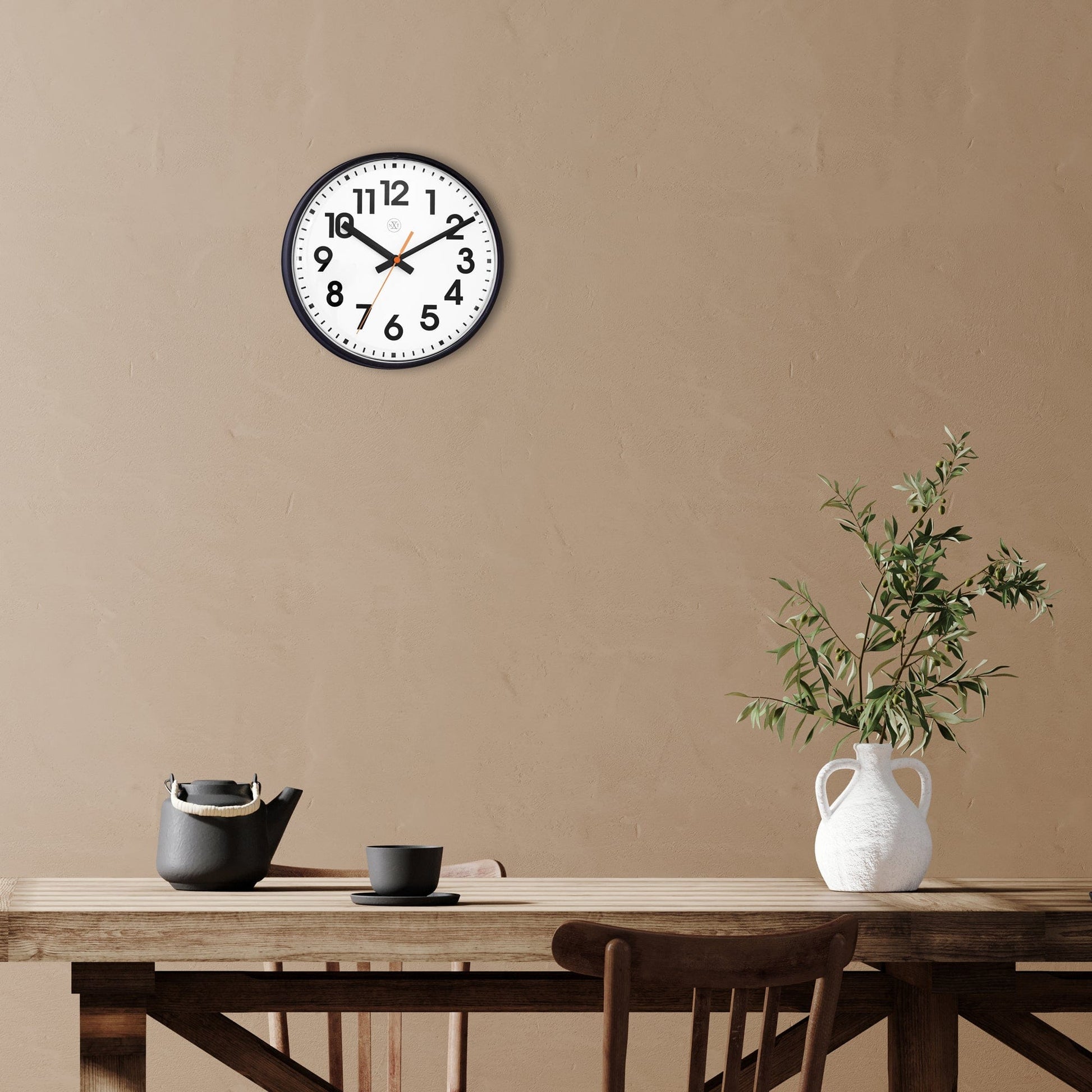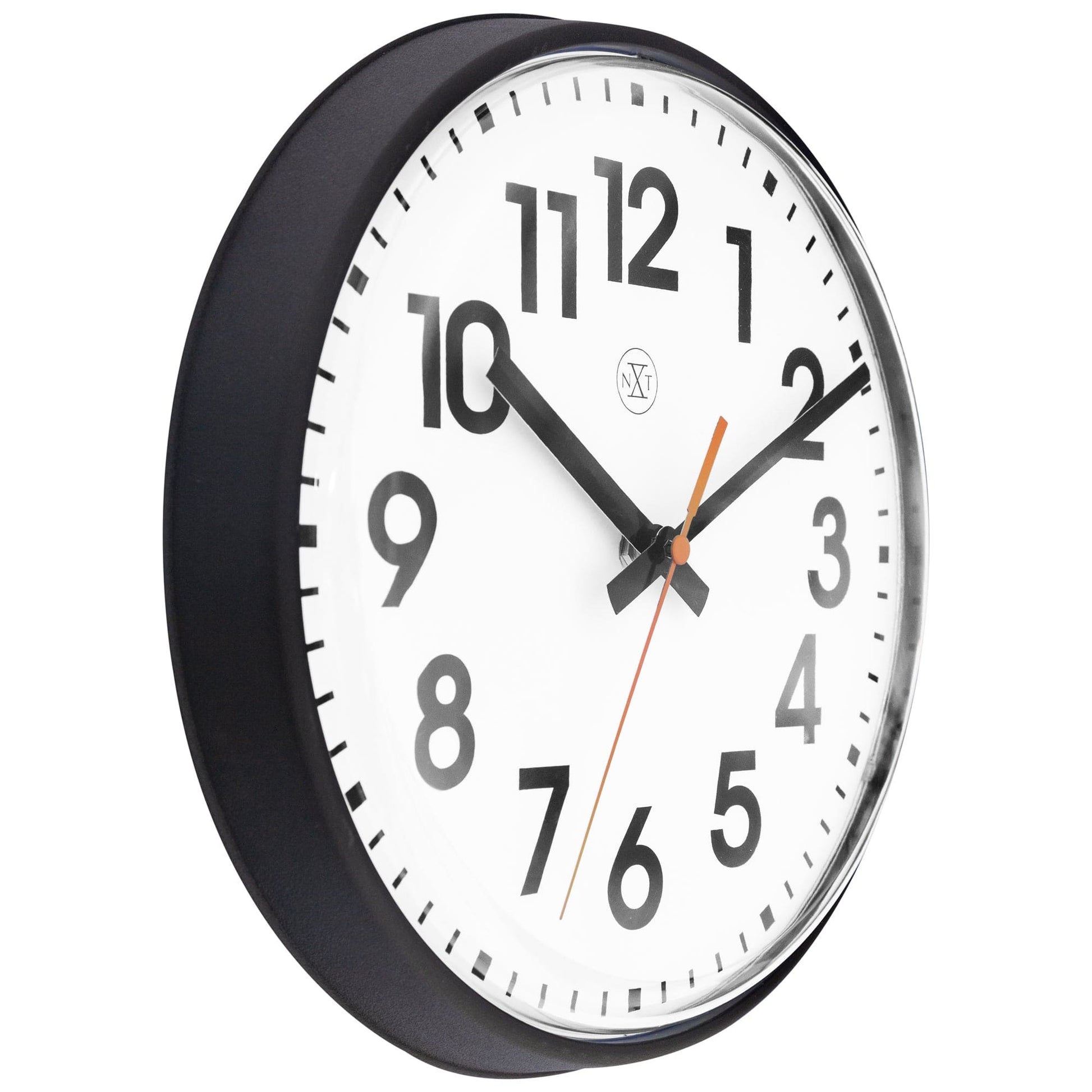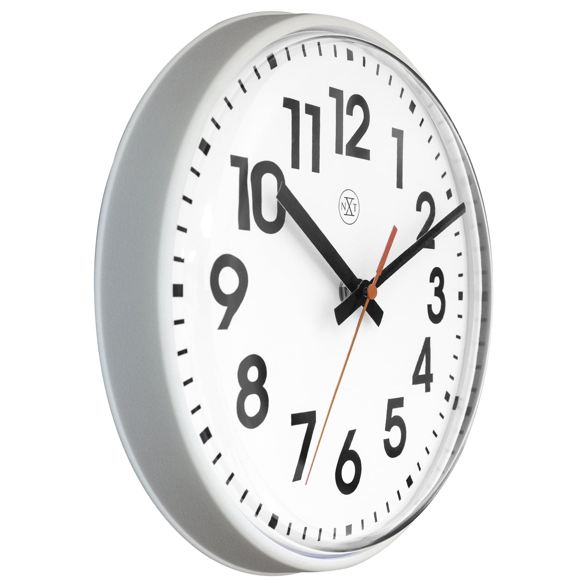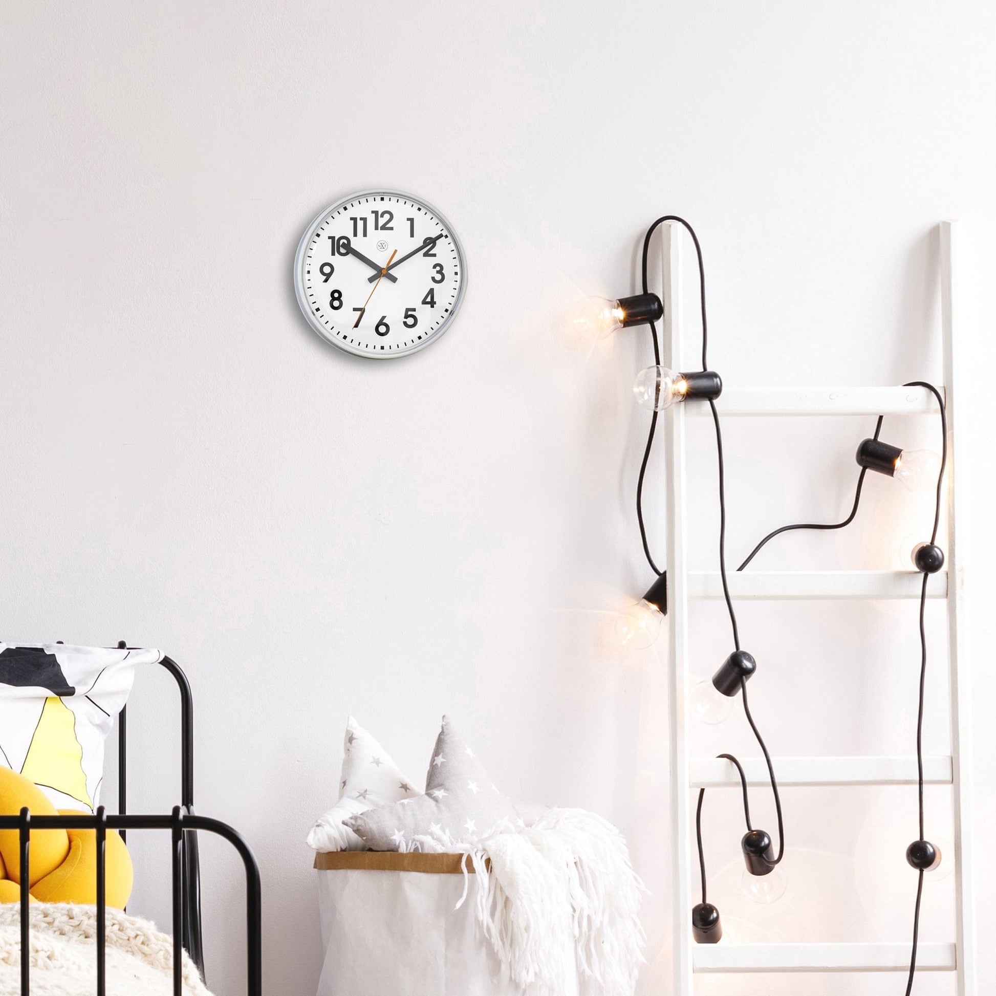 The nXt Peter silent wall clock (26cm) combines minimalist sophistication with functionality. It is a simple design with black Arabic numbers on a white dial and a white case framing a slightly dome shaped plastic cover. This clock uses 1 x AA battery (not included).