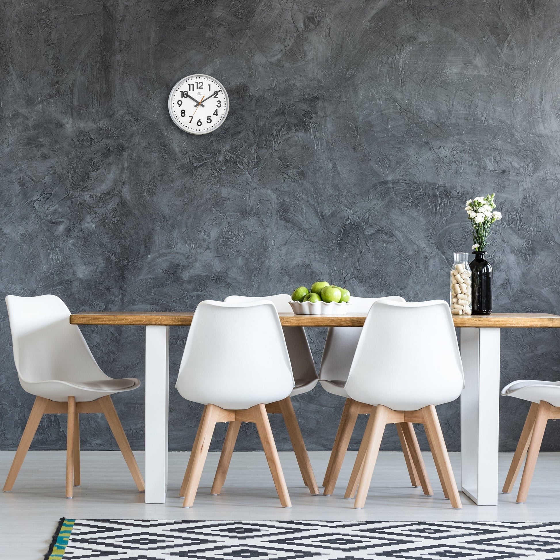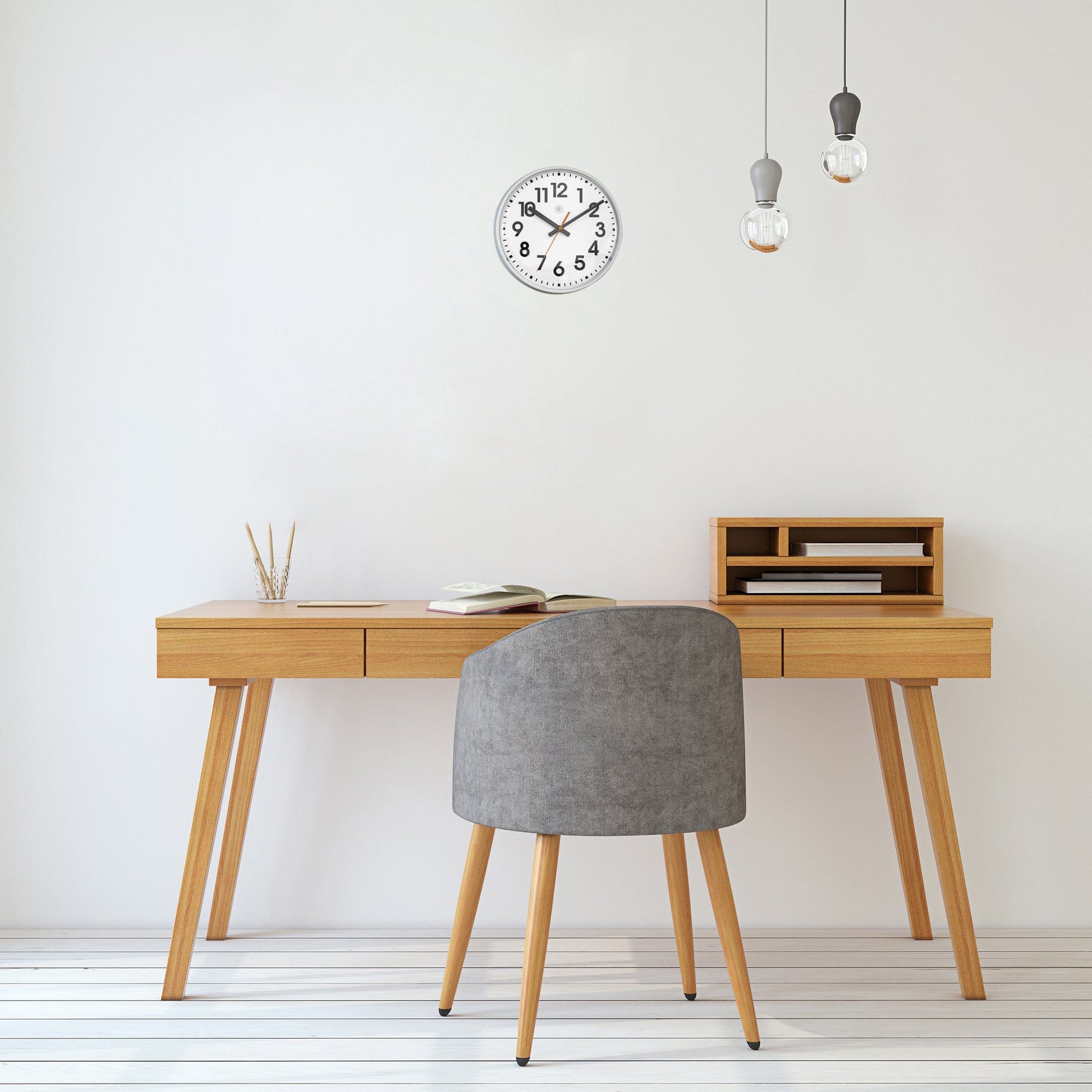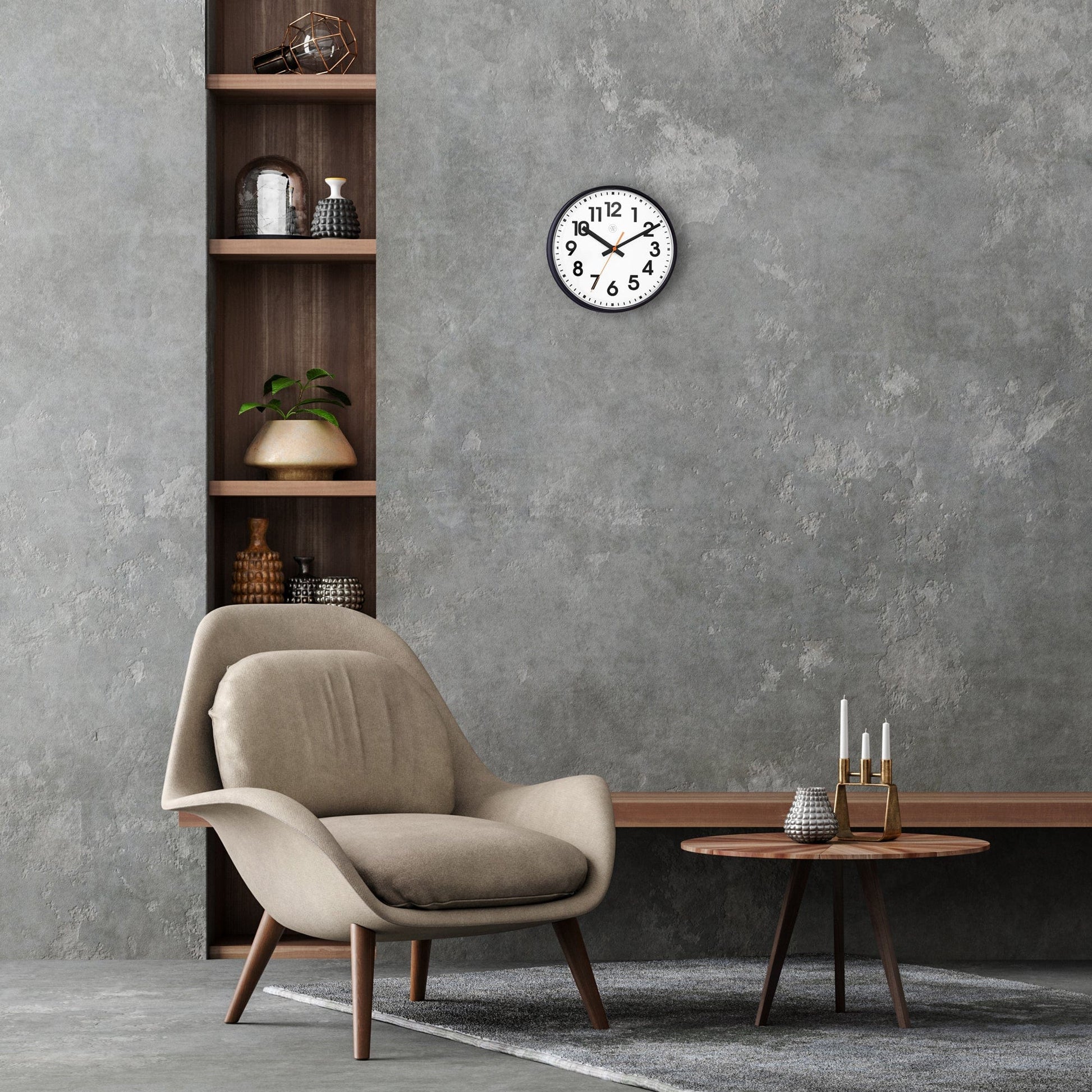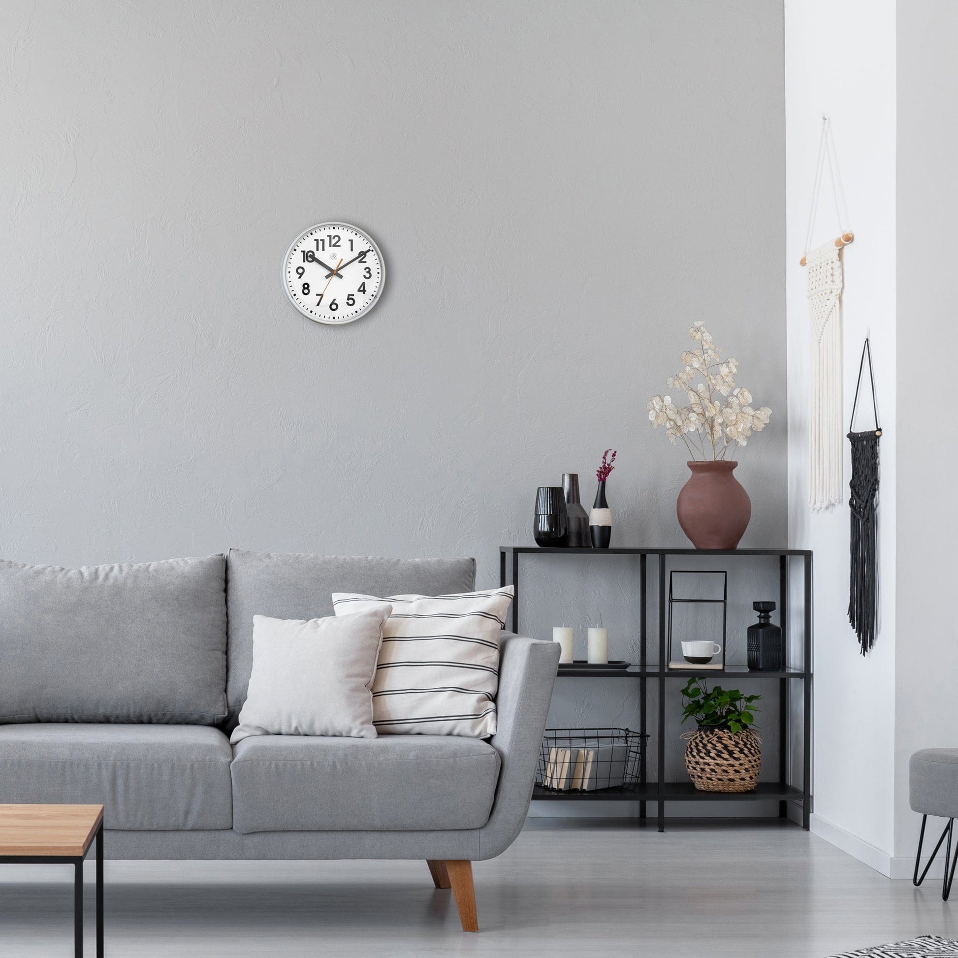 The nXt Peter silent wall clock (26cm) combines minimalist sophistication with functionality. It is a simple design with black Arabic numbers on a white dial and a white case framing a slightly dome shaped plastic cover. This clock uses 1 x AA battery (not included).
