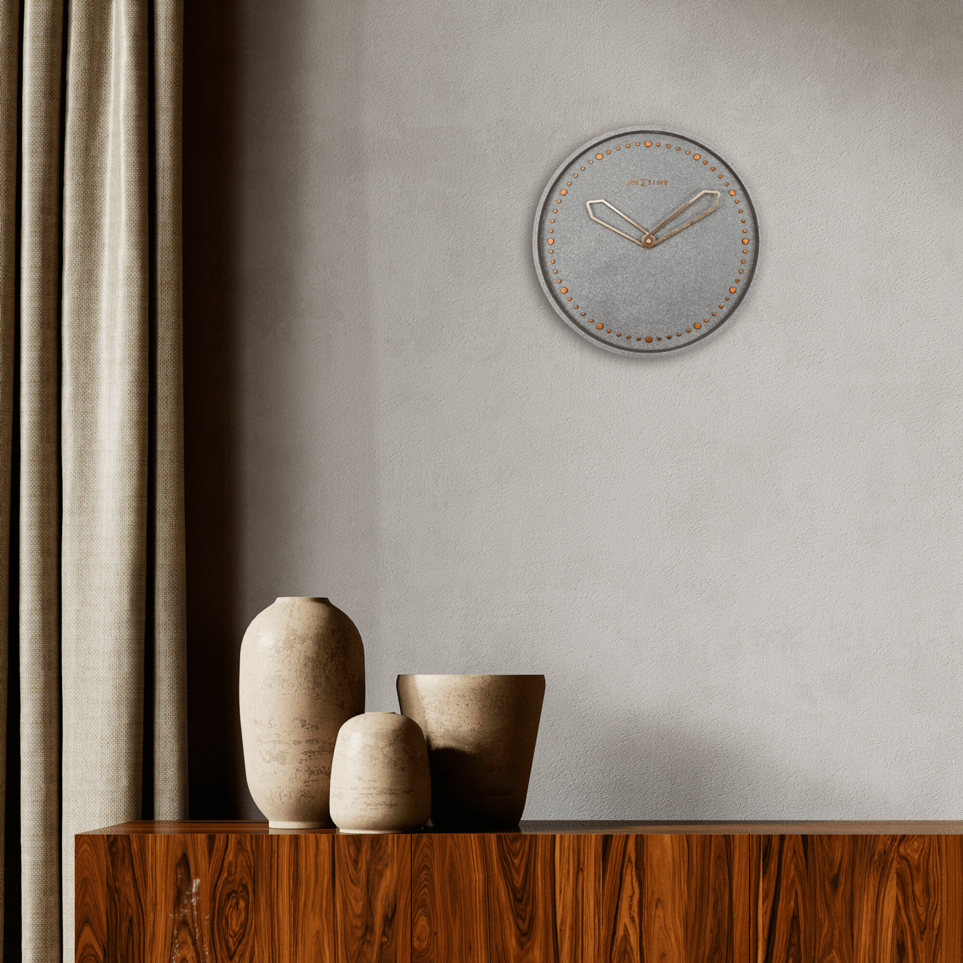 The NeXtime "Cross" wall clock is designed by Chantal Drenthe and Jette Scheib. The strong and fascinating contrast between cold rough concrete and the shiny rose gold element makes this clock a real eye-catcher in a trendy and modern home. This clock is silent and runs on 1 AA battery (not included).