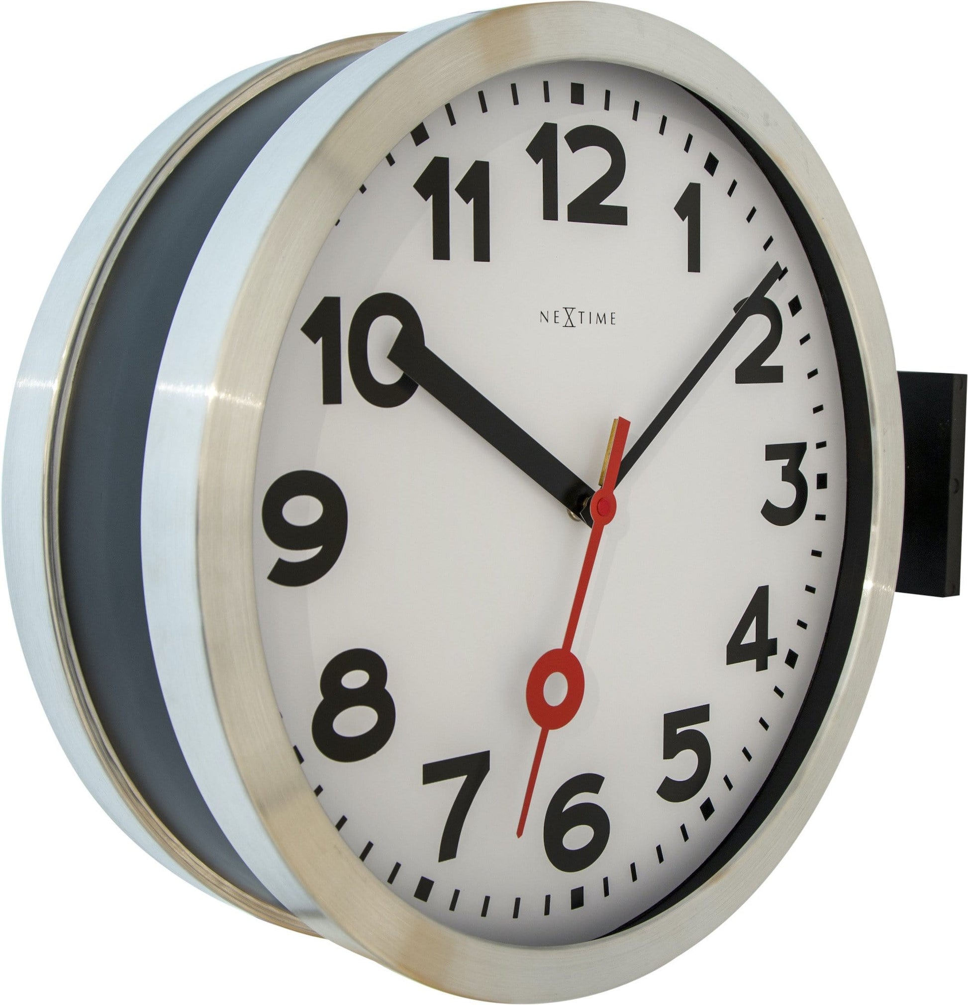 The NeXtime "Station Double" is a double-sided wall clock made of aluminum and glass. This station clock has two clock faces, a standard to hang the clock anywhere and a silent movement. You can view the time from two different angles! It runs on 2 AA battery (not included).