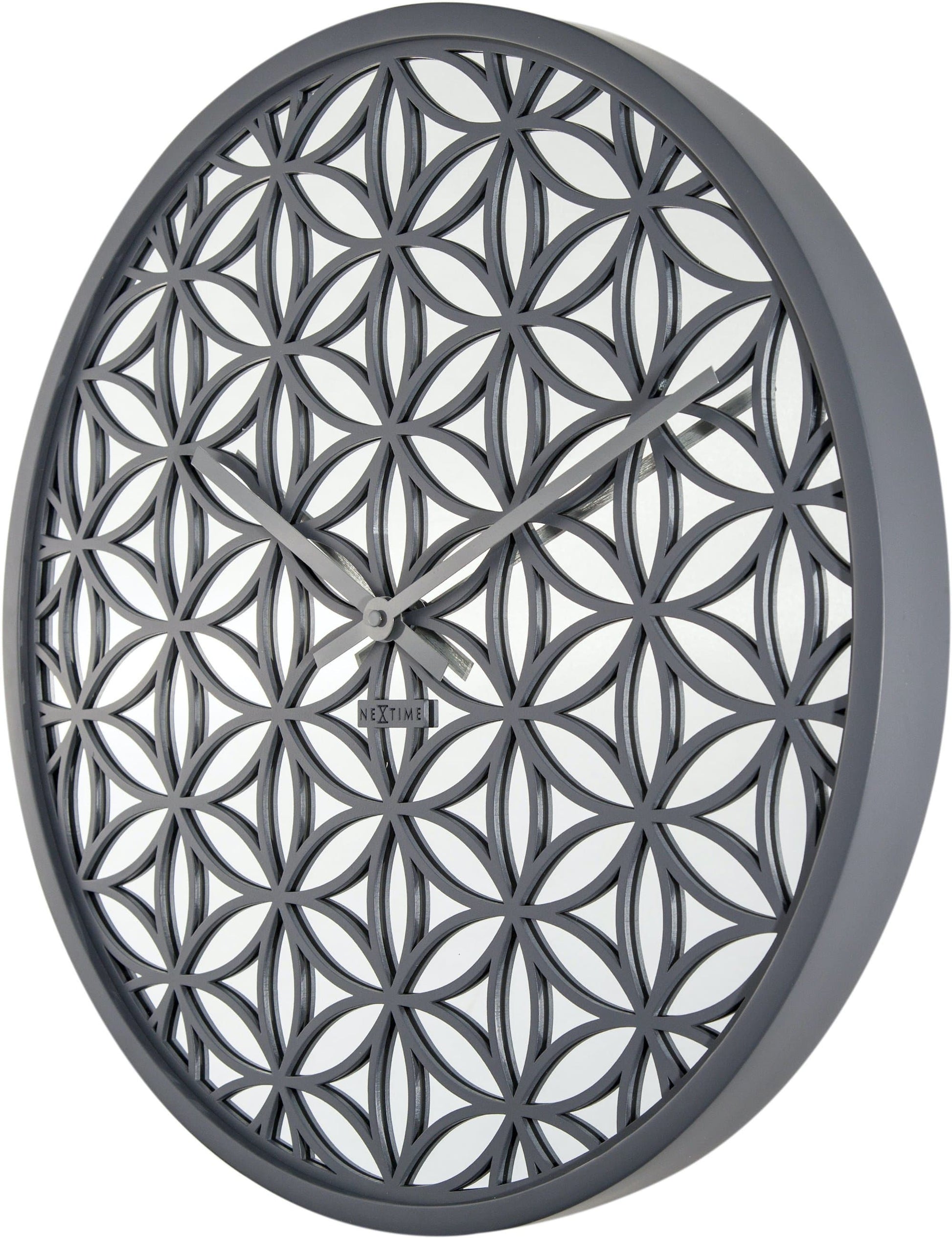 The NeXtime "Bella Mirror" is a large wall clock designed by Jette Scheib. The case and flower pattern are made of wood with a mirrored glass behind it. This silent clock gives an oriental feeling to your home. It runs on 1 AA battery (not included).