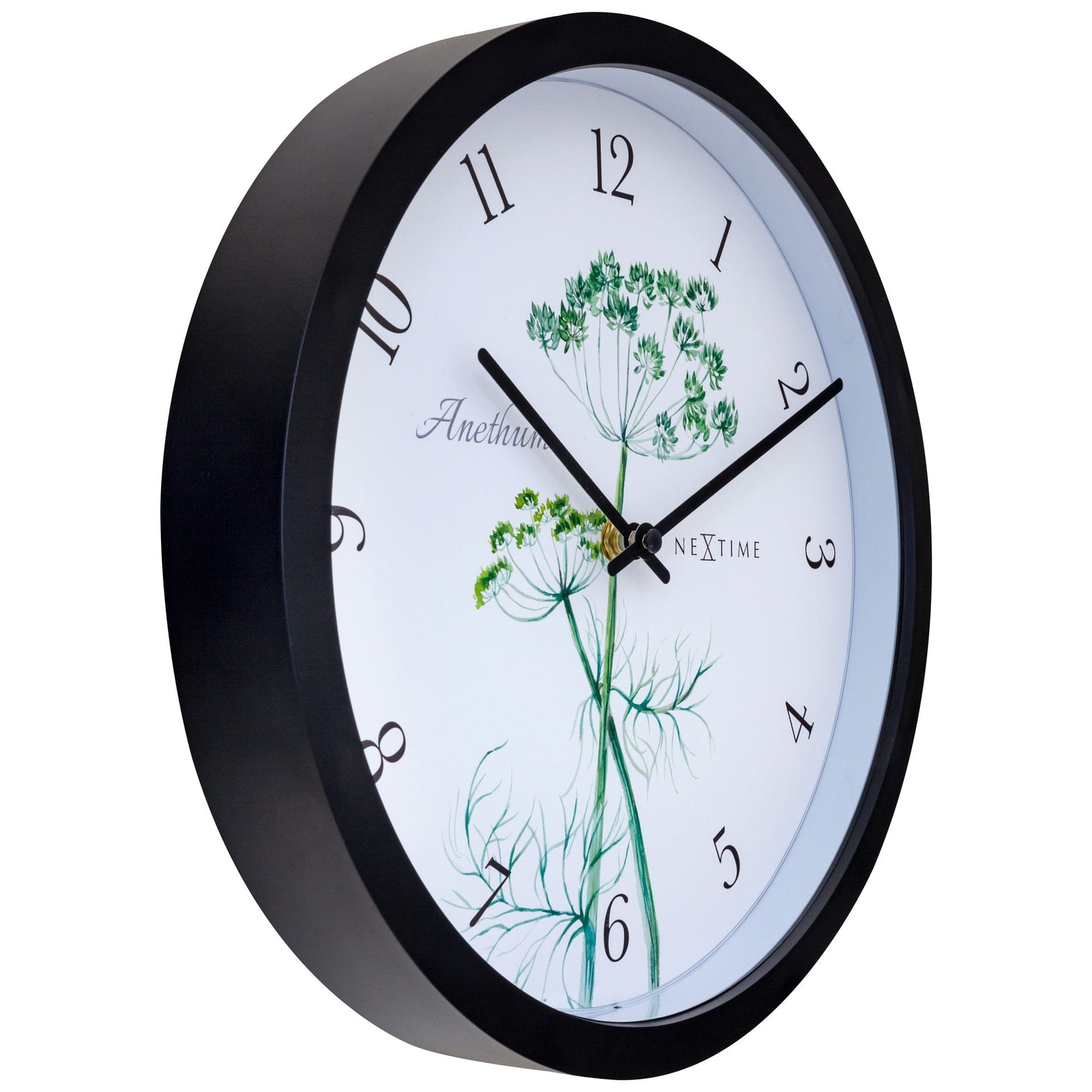 The NeXtime Anethium weatherproof wall clock is functional and a lovely decoration at the same time. The clock has a black case, a clear black number index and simple black hands . The dial features a special vintage watercolor illustration of dills, which symbolise happiness, wealth and passion. The clock is 30.5cm and runs on 1 x AA battery (not included).
