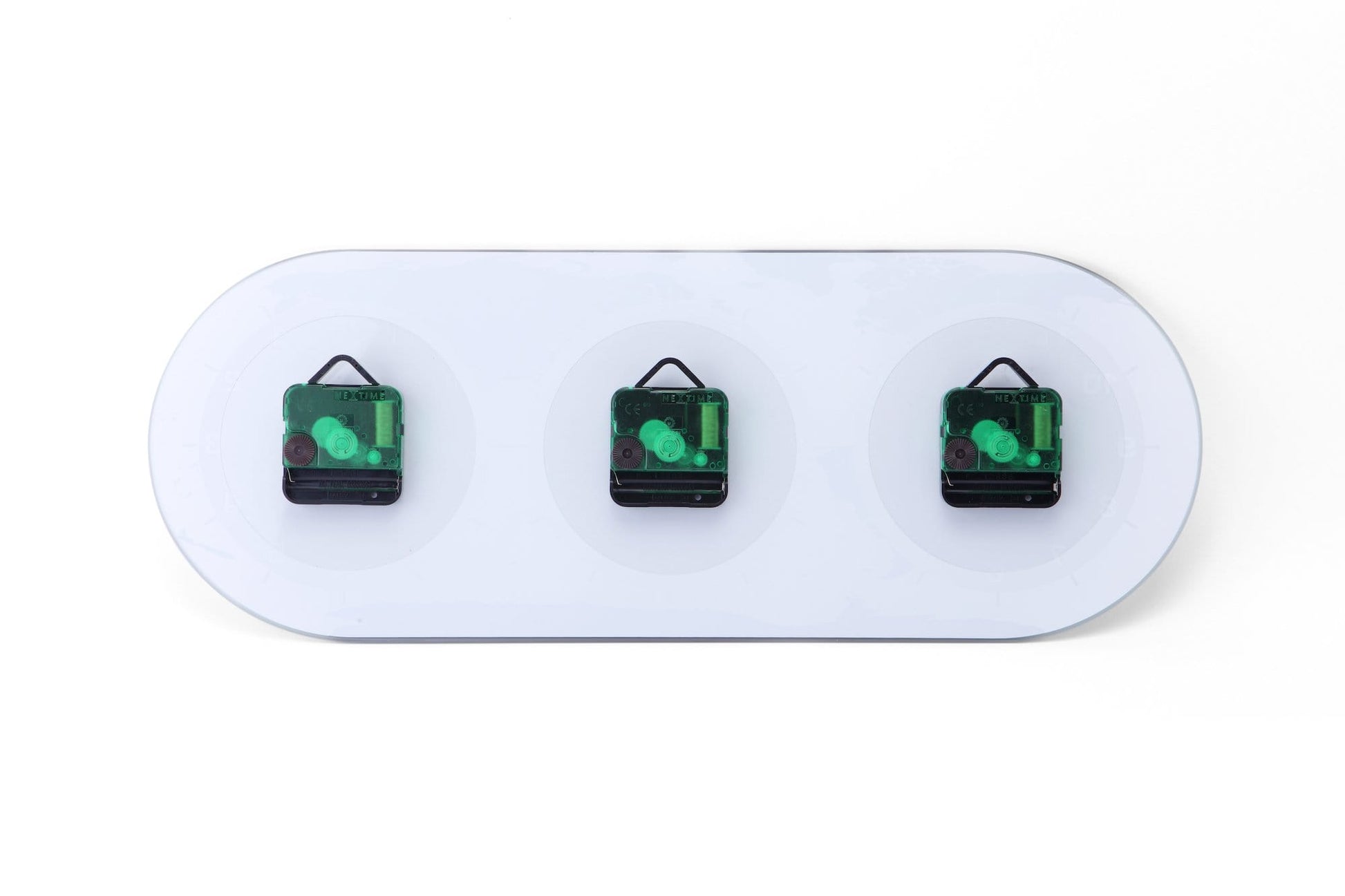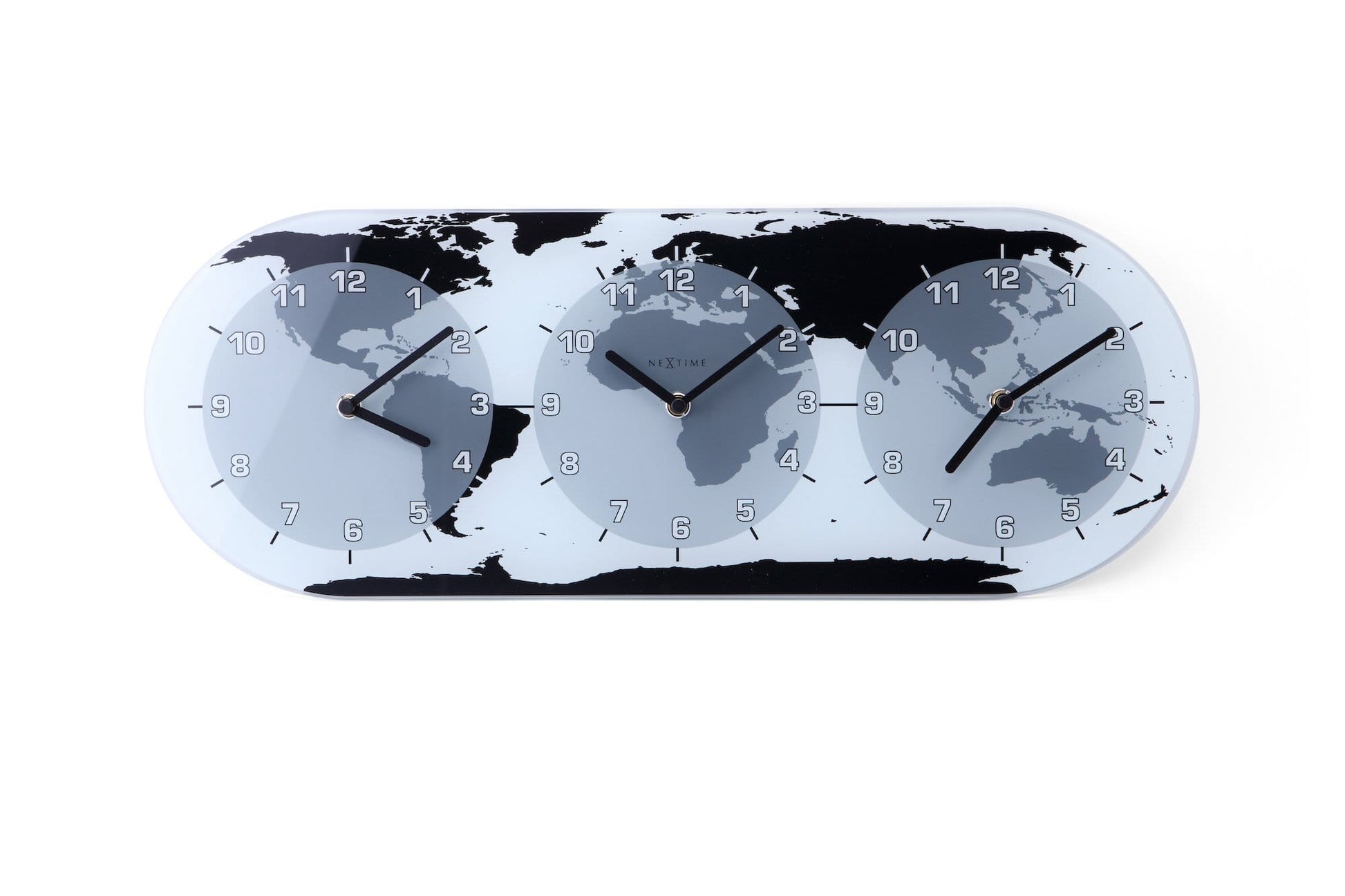 The NeXtime "Mondial" is a large world time clock made of glass. This clock makes it possible to display three different time zones due to the three clock faces. This clock made of glass fits perfectly in every office. It runs on 3 AA batteries (not included).